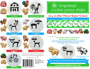 {"id":7602928648368,"title":"Farm 8 Disk Set for Cookie Presses","handle":"farm-8-disk-set-for-cookie-presses","description":"\u003cul\u003e\n\u003cli\u003eCookie Press Disks in 8 fun designs: Cow, Barn, Rooster\/Chicken, Horse 2, Sheep, Piggy, Goat and Tractor.\u003c\/li\u003e\n\u003cli\u003eMake Farm shaped cookies. Recipes \u0026amp; tips for pressing, troubleshooting, and decorating are included.\u003c\/li\u003e\n\u003cli\u003eMade with a special 3\/32\" thick, highly durable, BPA-free PLASTIC material.\u003c\/li\u003e\n\u003cli\u003eMade in the USA\u003c\/li\u003e\n\u003cli\u003eWomen\/Family-Owned Company\u003c\/li\u003e\n\u003cli\u003eNot A Universal Fit.\u003c\/li\u003e\n\u003cli\u003eFor Disk Sizing information please look at the Disk Sizing image to the left or in Presses We Fit located on Header.\u003c\/li\u003e\n\u003cli\u003eTo Enlarge Images just click on the image.\u003c\/li\u003e\n\u003cli\u003eIf you have any questions about Disk Sizing, please email us at doughwoes@impressbakeware.com and we can help you.\u003c\/li\u003e\n\u003c\/ul\u003e\n\u003cp\u003e \u003c\/p\u003e","published_at":"2024-06-03T05:24:34-06:00","created_at":"2024-05-03T14:30:07-06:00","vendor":"Impress! Bakeware","type":"","tags":[],"price":1695,"price_min":1695,"price_max":1695,"available":true,"price_varies":false,"compare_at_price":null,"compare_at_price_min":0,"compare_at_price_max":0,"compare_at_price_varies":false,"variants":[{"id":43531822235824,"title":"Default Title","option1":"Default Title","option2":null,"option3":null,"sku":null,"requires_shipping":true,"taxable":true,"featured_image":null,"available":true,"name":"Farm 8 Disk Set for Cookie Presses","public_title":null,"options":["Default Title"],"price":1695,"weight":85,"compare_at_price":null,"inventory_management":"shopify","barcode":null,"requires_selling_plan":false,"selling_plan_allocations":[]}],"images":["\/\/www.impressbakeware.com\/cdn\/shop\/files\/FarmCookiePressDiskSetspritz_2024Impress_Bakeware_LLCh_c18a446d-1eb5-42dc-bce6-ce9a924442ef.jpg?v=1717012851","\/\/www.impressbakeware.com\/cdn\/shop\/files\/FarmCookiePressDiskSetspritz_2024Impress_Bakeware_LLC.jpg?v=1717012851","\/\/www.impressbakeware.com\/cdn\/shop\/files\/INTERIOR-INTERIORPAGEregisteredtrademarkFINAL4-17-21.jpg?v=1717012851","\/\/www.impressbakeware.com\/cdn\/shop\/files\/Amazon-DiskSizingUpdateJanuary2021_a4b99bb1-b3ca-4093-ac8b-5a3e1d1e882f.jpg?v=1717012851"],"featured_image":"\/\/www.impressbakeware.com\/cdn\/shop\/files\/FarmCookiePressDiskSetspritz_2024Impress_Bakeware_LLCh_c18a446d-1eb5-42dc-bce6-ce9a924442ef.jpg?v=1717012851","options":["Title"],"media":[{"alt":null,"id":26568574730416,"position":1,"preview_image":{"aspect_ratio":2.989,"height":648,"width":1937,"src":"\/\/www.impressbakeware.com\/cdn\/shop\/files\/FarmCookiePressDiskSetspritz_2024Impress_Bakeware_LLCh_c18a446d-1eb5-42dc-bce6-ce9a924442ef.jpg?v=1717012851"},"aspect_ratio":2.989,"height":648,"media_type":"image","src":"\/\/www.impressbakeware.com\/cdn\/shop\/files\/FarmCookiePressDiskSetspritz_2024Impress_Bakeware_LLCh_c18a446d-1eb5-42dc-bce6-ce9a924442ef.jpg?v=1717012851","width":1937},{"alt":null,"id":26568575123632,"position":2,"preview_image":{"aspect_ratio":1.31,"height":3099,"width":4059,"src":"\/\/www.impressbakeware.com\/cdn\/shop\/files\/FarmCookiePressDiskSetspritz_2024Impress_Bakeware_LLC.jpg?v=1717012851"},"aspect_ratio":1.31,"height":3099,"media_type":"image","src":"\/\/www.impressbakeware.com\/cdn\/shop\/files\/FarmCookiePressDiskSetspritz_2024Impress_Bakeware_LLC.jpg?v=1717012851","width":4059},{"alt":null,"id":26420459634864,"position":3,"preview_image":{"aspect_ratio":1.362,"height":2372,"width":3231,"src":"\/\/www.impressbakeware.com\/cdn\/shop\/files\/INTERIOR-INTERIORPAGEregisteredtrademarkFINAL4-17-21.jpg?v=1717012851"},"aspect_ratio":1.362,"height":2372,"media_type":"image","src":"\/\/www.impressbakeware.com\/cdn\/shop\/files\/INTERIOR-INTERIORPAGEregisteredtrademarkFINAL4-17-21.jpg?v=1717012851","width":3231},{"alt":null,"id":26420459667632,"position":4,"preview_image":{"aspect_ratio":1.322,"height":2468,"width":3263,"src":"\/\/www.impressbakeware.com\/cdn\/shop\/files\/Amazon-DiskSizingUpdateJanuary2021_a4b99bb1-b3ca-4093-ac8b-5a3e1d1e882f.jpg?v=1717012851"},"aspect_ratio":1.322,"height":2468,"media_type":"image","src":"\/\/www.impressbakeware.com\/cdn\/shop\/files\/Amazon-DiskSizingUpdateJanuary2021_a4b99bb1-b3ca-4093-ac8b-5a3e1d1e882f.jpg?v=1717012851","width":3263}],"requires_selling_plan":false,"selling_plan_groups":[],"content":"\u003cul\u003e\n\u003cli\u003eCookie Press Disks in 8 fun designs: Cow, Barn, Rooster\/Chicken, Horse 2, Sheep, Piggy, Goat and Tractor.\u003c\/li\u003e\n\u003cli\u003eMake Farm shaped cookies. Recipes \u0026amp; tips for pressing, troubleshooting, and decorating are included.\u003c\/li\u003e\n\u003cli\u003eMade with a special 3\/32\" thick, highly durable, BPA-free PLASTIC material.\u003c\/li\u003e\n\u003cli\u003eMade in the USA\u003c\/li\u003e\n\u003cli\u003eWomen\/Family-Owned Company\u003c\/li\u003e\n\u003cli\u003eNot A Universal Fit.\u003c\/li\u003e\n\u003cli\u003eFor Disk Sizing information please look at the Disk Sizing image to the left or in Presses We Fit located on Header.\u003c\/li\u003e\n\u003cli\u003eTo Enlarge Images just click on the image.\u003c\/li\u003e\n\u003cli\u003eIf you have any questions about Disk Sizing, please email us at doughwoes@impressbakeware.com and we can help you.\u003c\/li\u003e\n\u003c\/ul\u003e\n\u003cp\u003e \u003c\/p\u003e"}