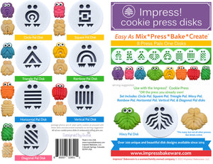 {"id":7639201939632,"title":"Press Pals One 8 Disk Set for Cookie Presses","handle":"press-pals-one-8-disk-set-for-cookie-presses","description":"\u003cul\u003e\n\u003cli\u003eCookie Press Disks in 8 fun designs: Wavy Pal, Circle Pal, Square Pal, Triangle Pal, Rainbow Pal, Horizontal Pal, Vertical Pal, and Diagonal Pal. \u003c\/li\u003e\n\u003cli\u003eMake Press Pal-shaped cookies. Recipes \u0026amp; tips for pressing, troubleshooting, and decorating are included.\u003c\/li\u003e\n\u003cli\u003eMade with a special 3\/32\" thick, highly durable, BPA-free PLASTIC material.\u003c\/li\u003e\n\u003cli\u003eMade in the USA\u003c\/li\u003e\n\u003cli\u003eWomen\/Family-Owned Company\u003c\/li\u003e\n\u003cli\u003eNot A Universal Fit.\u003c\/li\u003e\n\u003cli\u003eFor Disk Sizing information please look at the Disk Sizing image to the left or in Presses We Fit located on Header.\u003c\/li\u003e\n\u003cli\u003eTo Enlarge Images just click on the image.\u003c\/li\u003e\n\u003cli\u003eIf you have any questions about Disk Sizing, please email us at doughwoes@impressbakeware.com and we can help you.\u003c\/li\u003e\n\u003c\/ul\u003e\n\u003cp\u003e \u003c\/p\u003e","published_at":"2024-06-03T05:24:57-06:00","created_at":"2024-05-28T19:54:41-06:00","vendor":"Impress! Bakeware","type":"","tags":[],"price":1695,"price_min":1695,"price_max":1695,"available":true,"price_varies":false,"compare_at_price":null,"compare_at_price_min":0,"compare_at_price_max":0,"compare_at_price_varies":false,"variants":[{"id":43659812307120,"title":"Default Title","option1":"Default Title","option2":null,"option3":null,"sku":null,"requires_shipping":true,"taxable":true,"featured_image":null,"available":true,"name":"Press Pals One 8 Disk Set for Cookie Presses","public_title":null,"options":["Default Title"],"price":1695,"weight":85,"compare_at_price":null,"inventory_management":"shopify","barcode":null,"requires_selling_plan":false,"selling_plan_allocations":[]}],"images":["\/\/www.impressbakeware.com\/cdn\/shop\/files\/PressPalsCookiePressDiskSetspritz_2024Impress_Bakeware_LLCh.jpg?v=1716947865","\/\/www.impressbakeware.com\/cdn\/shop\/files\/PressPalsOneCookiePressDiskSetspritz_2024Impress_Bakeware_LLC.jpg?v=1717012880","\/\/www.impressbakeware.com\/cdn\/shop\/files\/INTERIOR-INTERIORPAGEregisteredtrademarkFINAL4-17-21_2eb0f974-832a-4148-94c7-89cb03268d9a.jpg?v=1717012880","\/\/www.impressbakeware.com\/cdn\/shop\/files\/Amazon-DiskSizingUpdateJanuary2021_bb39a72a-6be6-452b-90f6-b7a3d756c166.jpg?v=1717012880"],"featured_image":"\/\/www.impressbakeware.com\/cdn\/shop\/files\/PressPalsCookiePressDiskSetspritz_2024Impress_Bakeware_LLCh.jpg?v=1716947865","options":["Title"],"media":[{"alt":null,"id":26558808457392,"position":1,"preview_image":{"aspect_ratio":2.953,"height":527,"width":1556,"src":"\/\/www.impressbakeware.com\/cdn\/shop\/files\/PressPalsCookiePressDiskSetspritz_2024Impress_Bakeware_LLCh.jpg?v=1716947865"},"aspect_ratio":2.953,"height":527,"media_type":"image","src":"\/\/www.impressbakeware.com\/cdn\/shop\/files\/PressPalsCookiePressDiskSetspritz_2024Impress_Bakeware_LLCh.jpg?v=1716947865","width":1556},{"alt":null,"id":26568576270512,"position":2,"preview_image":{"aspect_ratio":1.299,"height":2749,"width":3570,"src":"\/\/www.impressbakeware.com\/cdn\/shop\/files\/PressPalsOneCookiePressDiskSetspritz_2024Impress_Bakeware_LLC.jpg?v=1717012880"},"aspect_ratio":1.299,"height":2749,"media_type":"image","src":"\/\/www.impressbakeware.com\/cdn\/shop\/files\/PressPalsOneCookiePressDiskSetspritz_2024Impress_Bakeware_LLC.jpg?v=1717012880","width":3570},{"alt":null,"id":26558502273200,"position":3,"preview_image":{"aspect_ratio":1.362,"height":2372,"width":3231,"src":"\/\/www.impressbakeware.com\/cdn\/shop\/files\/INTERIOR-INTERIORPAGEregisteredtrademarkFINAL4-17-21_2eb0f974-832a-4148-94c7-89cb03268d9a.jpg?v=1717012880"},"aspect_ratio":1.362,"height":2372,"media_type":"image","src":"\/\/www.impressbakeware.com\/cdn\/shop\/files\/INTERIOR-INTERIORPAGEregisteredtrademarkFINAL4-17-21_2eb0f974-832a-4148-94c7-89cb03268d9a.jpg?v=1717012880","width":3231},{"alt":null,"id":26558502338736,"position":4,"preview_image":{"aspect_ratio":1.322,"height":2468,"width":3263,"src":"\/\/www.impressbakeware.com\/cdn\/shop\/files\/Amazon-DiskSizingUpdateJanuary2021_bb39a72a-6be6-452b-90f6-b7a3d756c166.jpg?v=1717012880"},"aspect_ratio":1.322,"height":2468,"media_type":"image","src":"\/\/www.impressbakeware.com\/cdn\/shop\/files\/Amazon-DiskSizingUpdateJanuary2021_bb39a72a-6be6-452b-90f6-b7a3d756c166.jpg?v=1717012880","width":3263}],"requires_selling_plan":false,"selling_plan_groups":[],"content":"\u003cul\u003e\n\u003cli\u003eCookie Press Disks in 8 fun designs: Wavy Pal, Circle Pal, Square Pal, Triangle Pal, Rainbow Pal, Horizontal Pal, Vertical Pal, and Diagonal Pal. \u003c\/li\u003e\n\u003cli\u003eMake Press Pal-shaped cookies. Recipes \u0026amp; tips for pressing, troubleshooting, and decorating are included.\u003c\/li\u003e\n\u003cli\u003eMade with a special 3\/32\" thick, highly durable, BPA-free PLASTIC material.\u003c\/li\u003e\n\u003cli\u003eMade in the USA\u003c\/li\u003e\n\u003cli\u003eWomen\/Family-Owned Company\u003c\/li\u003e\n\u003cli\u003eNot A Universal Fit.\u003c\/li\u003e\n\u003cli\u003eFor Disk Sizing information please look at the Disk Sizing image to the left or in Presses We Fit located on Header.\u003c\/li\u003e\n\u003cli\u003eTo Enlarge Images just click on the image.\u003c\/li\u003e\n\u003cli\u003eIf you have any questions about Disk Sizing, please email us at doughwoes@impressbakeware.com and we can help you.\u003c\/li\u003e\n\u003c\/ul\u003e\n\u003cp\u003e \u003c\/p\u003e"}